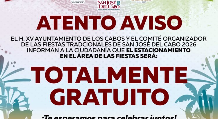 Los Cabos, Baja California Sur.– El XV Ayuntamiento de Los Cabos informa que a partir de este jueves 19 de marzo, el estacionamiento ubicado en el área donde se desarrollan las Fiestas Tradicionales San José del Cabo 2026 será de acceso gratuito para la población.