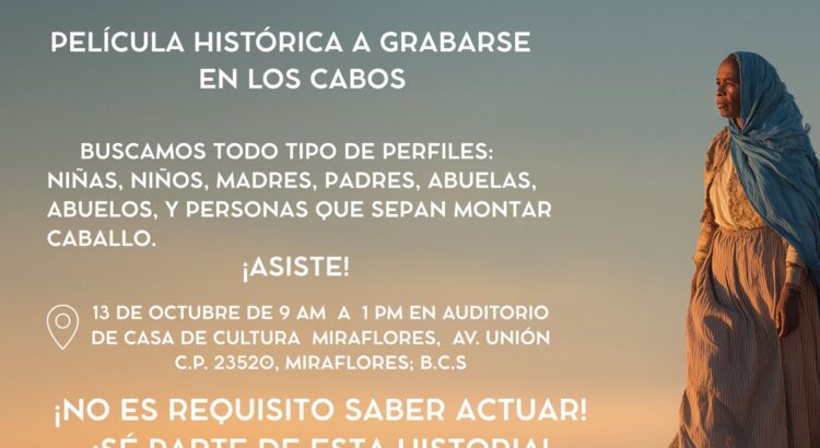 Los Cabos, Baja California Sur.– Con el objetivo de fomentar la participación de talentos locales y fortalecer la identidad cultural de la región, el XV Ayuntamiento de Los Cabos replica la invitación de la casa productora APIX, para que la ciudadanía participe en el casting de una película histórica que se filmará en distintas localidades del municipio.