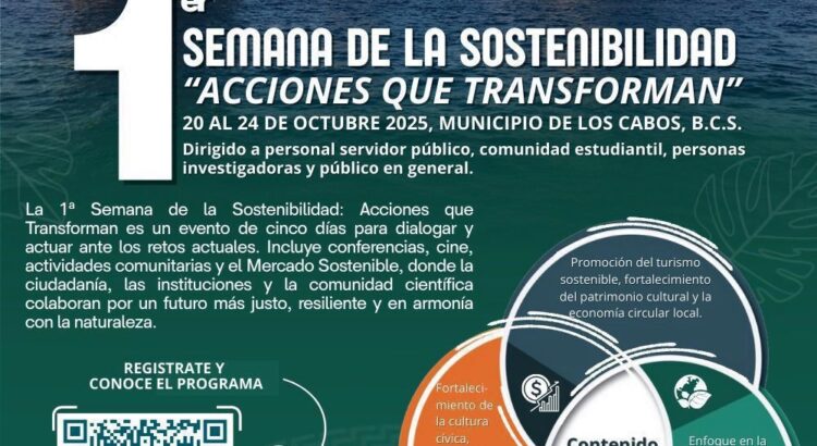Los Cabos, Baja California Sur.- Con el compromiso de fortalecer la cultura cívica, la cohesión comunitaria y la participación ciudadana, el XV Ayuntamiento de Los Cabos, a través del Instituto de Desarrollo Sostenible (INDESO), invita a la ciudadanía a participar en la primera “Semana de la Sostenibilidad: Acciones que Transforman”, un espacio de encuentro, diálogo y acción frente a los retos ambientales y sociales que marcan la actualidad.