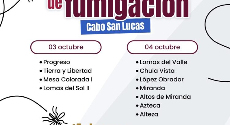Los Cabos, Baja California Sur.– El XV Ayuntamiento de Los Cabos, que preside Christian Agúndez Gómez, en coordinación con la Secretaría de Salud del Gobierno de Baja California Sur, informa que del 03 al 10 de octubre se desarrollará la segunda etapa de las jornadas de fumigación contra el mosquito transmisor del dengue en Cabo San Lucas. El viernes 03 de octubre será en las colonias El Progreso, Tierra y Libertad, Mesa Colorada I y Lomas del Sol III.