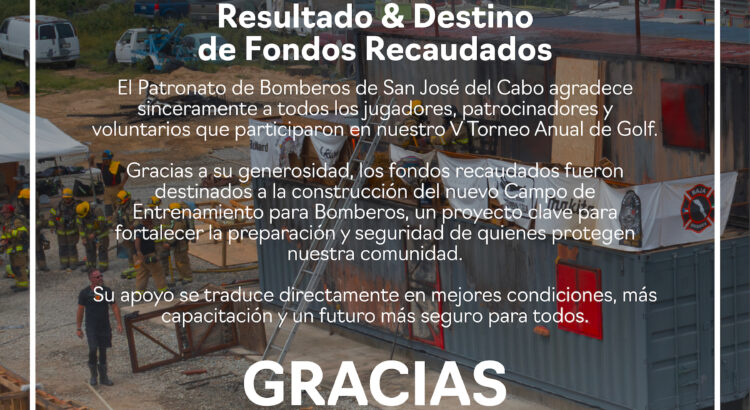 Los Cabos, Baja California Sur.- Gracias al apoyo de cada uno de los patrocinadores y jugadores que año con año se suman y se dan cita en el Torneo Anual de Golf que organiza el Patronato de Bomberos de San José del Cabo a beneficio del Departamento de Bomberos, y que les permite concretar parte de sus proyectos, en esta quinta edición, lograron recaudar un total de 508 mil 183.78 pesos, los cuales fueron destinados en su totalidad, para abonar a la consolidación de la primera etapa del Campo de Entrenamiento de la institución bomberil.