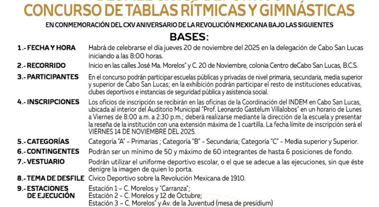 Los Cabos, Baja California Sur.- El XV Ayuntamiento de Los Cabos, a través del Instituto del Deporte del Municipio de Los Cabos (INDEM), en coordinación con la Dirección Municipal de Educación y sus coordinaciones delegacionales de Cabo San Lucas, convoca a todas las instituciones educativas públicas y privadas de nivel primaria, secundaria, medio superior y superior, así como a los clubes deportivos, a participar en el Desfile Cívico Deportivo y Concurso de Tablas Rítmicas y Gimnásticas, con motivo del 115º Aniversario de la Revolución Mexicana.