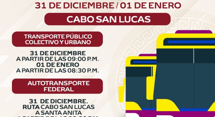 En San José del Cabo, el transporte público colectivo y urbano operará el 31 de diciembre hasta las 09:00 de la noche, mientras que el 01 de enero el servicio concluirá a las 08:00 de la noche .