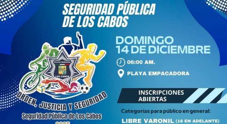 Los Cabos, Baja California Sur.– El XV Ayuntamiento de Los Cabos, a través de la Dirección General de Seguridad Pública, Policía Preventiva y Tránsito Municipal, invita a la ciudadanía a participar en la primera edición del Triatlón Seguridad Pública de Los Cabos, un evento deportivo que busca fortalecer la actividad física y el trabajo en equipo.