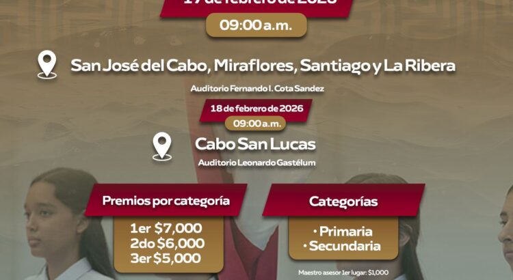 En Cabo San Lucas, el certamen se llevará a cabo el miércoles 18 de febrero de 2026, a las 09:00 horas, en el Auditorio Leonardo Gastélum, dirigido a estudiantes de nivel primaria y secundaria de dicho municipio.