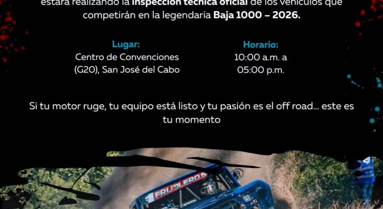 Los Cabos, Baja California Sur.– El XV Ayuntamiento de Los Cabos, a través de la Dirección Municipal de Relaciones Públicas, informa que este viernes 23 de enero se llevará a cabo en el municipio la inspección técnica oficial de los vehículos que competirán en la Baja 1000 2026, como parte de las actividades previas a esta emblemática competencia del off road internacional.