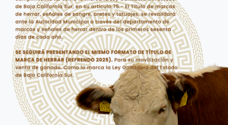 Los Cabos, Baja California Sur.– El XV Ayuntamiento de Los Cabos, a través de la Dirección General de Desarrollo Social, informa a las y los productores del sector ganadero de las distintas delegaciones municipales que es obligatorio realizar la revalidación del Título de Marcas de Herrar, señales de sangre, aretes y tatuajes, conforme a lo establecido en el artículo 75 de la Ley Ganadera del Estado de Baja California Sur.