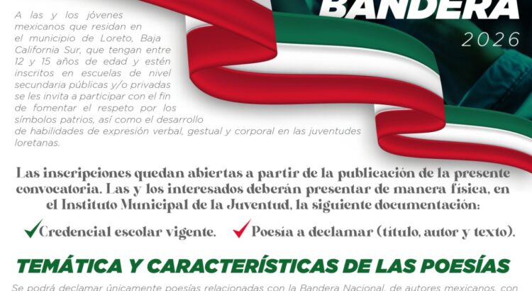 Loreto, B.C.S.- El XI Ayuntamiento de Loreto a través del Instituto Municipal de la Juventud (IMAJ), en colaboración con el Gobierno del Estado de Baja California Sur, convoca a participar en el “Concurso Municipal de Declamación Juvenil: Día de la Bandera 2026”, informó el titular del instituto de la juventud, Luis Enrique Amador Romero.