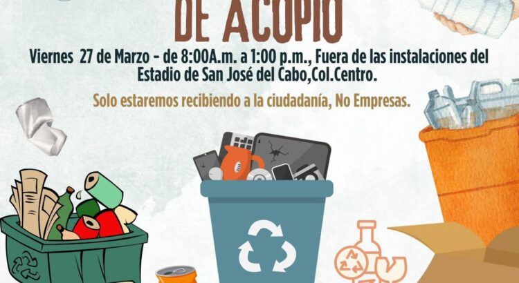 Los Cabos, Baja California Sur.– La Dirección General de Ecología y Medio Ambiente invita a la ciudadanía a participar en la jornada de acopio de materiales reciclables que se realizará el próximo viernes 27 de marzo en San José del Cabo.