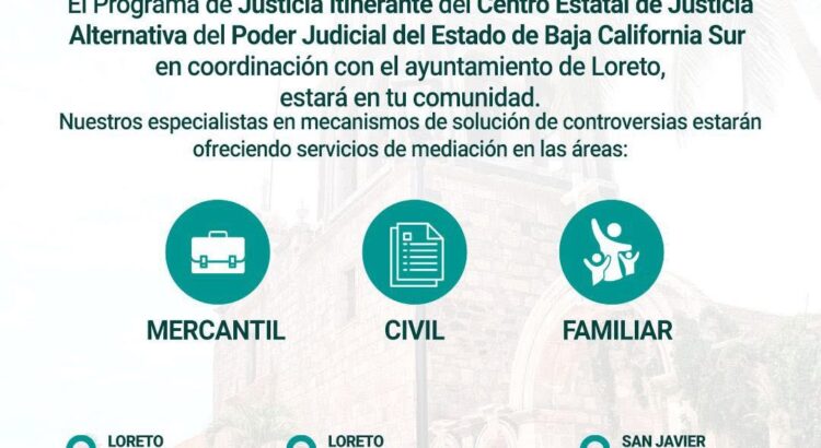 LORETO, B.C.S.–  Como parte de las políticas públicas orientadas a fortalecer el acceso a la justicia y promover la resolución pacífica de conflictos, el XI Ayuntamiento de Loreto, encabezado por la alcaldesa Paz Ochoa Amador, trabaja de manera coordinada con el Centro Estatal de Justicia Alternativa para acercar al municipio el Programa de Justicia Itinerante.